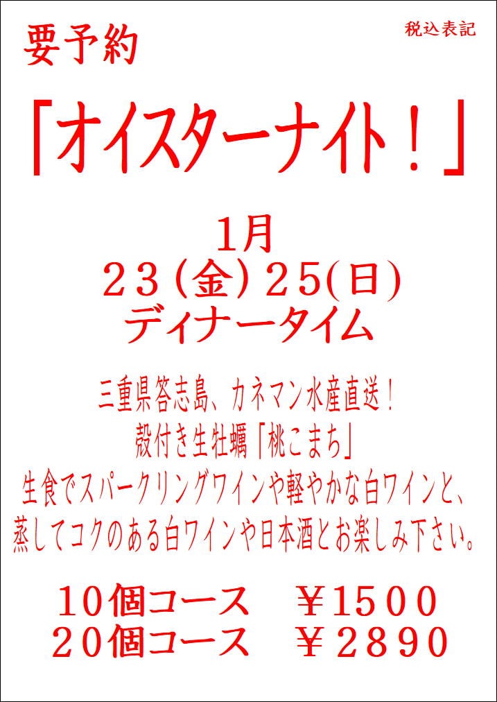 ※ネット予約の際は、「オイスターナイト、〇〇個コース×〇個希望」とご要望欄に必ずご記入下さい。