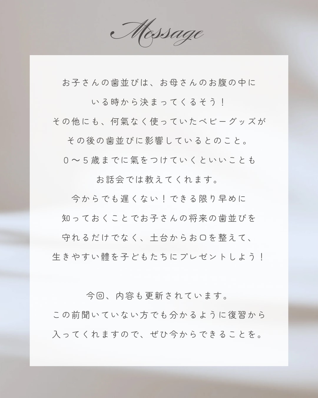 できる限り早めに知っておくことで、お子さんの将来の歯並びを守れるだけでなく、土台からお口を整えて、生きやすい體(からだ)を子どもたちにプレゼントしませんか。