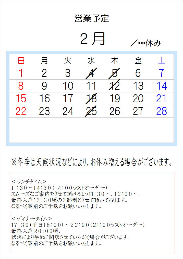 レストランイ'ヒロッシェからのお知らせ 2026.2月の営業予定 更新