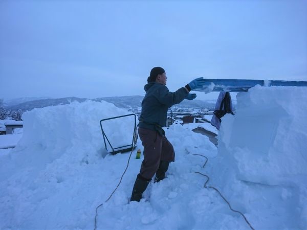 屋根の上に1.5mの雪が積もっているので、屋根雪掘りをしないと家が壊れてしまいます。