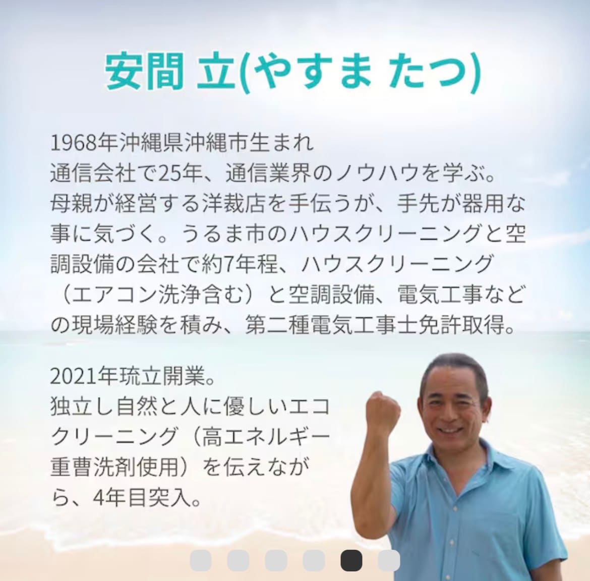・うるま市のハウスクリーニングと空調設備の会社で約7年程、ハウスクリーニング(エアコン洗浄含む)と空調設備、電気工事などの現場経験を積み、第二種電気工事士免許取得。