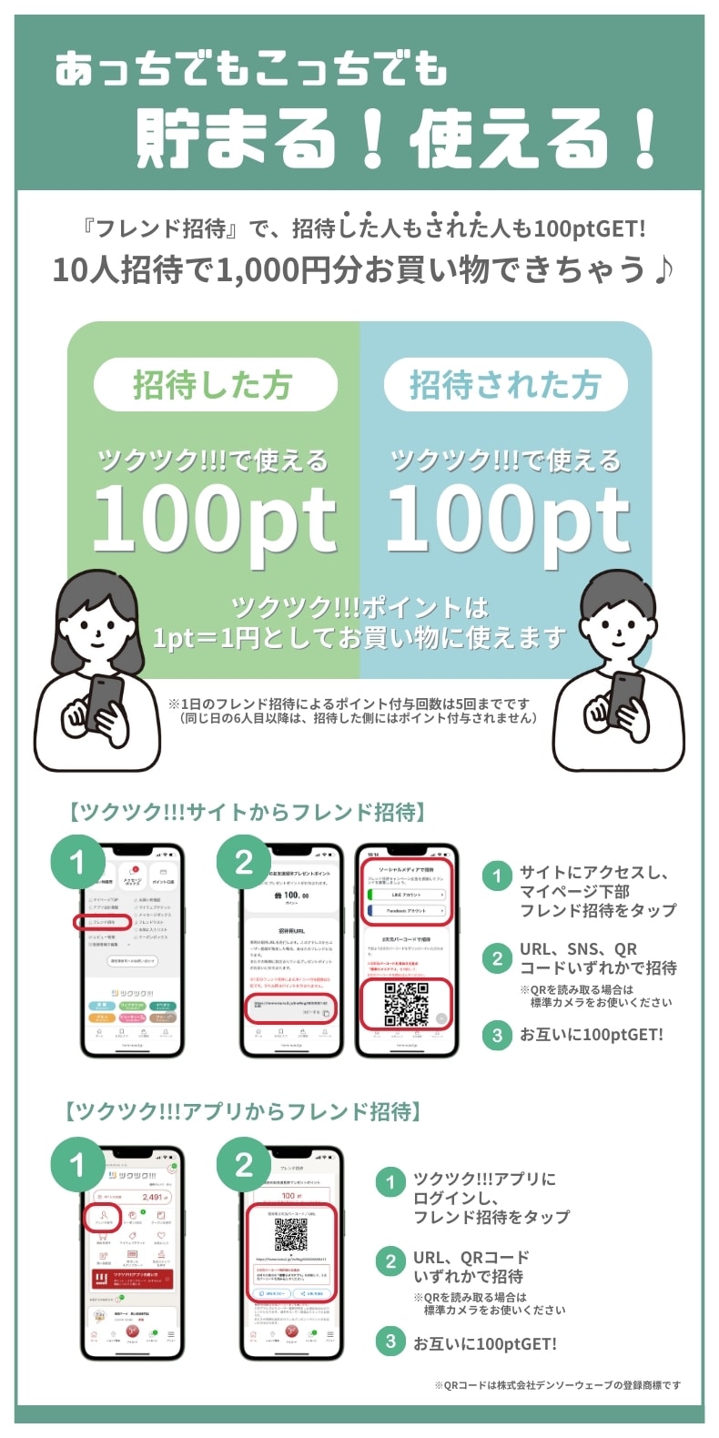 1人ご招待する毎に、100円分のポイントがお互いに必ずもらえます!(1日最大5名まで)