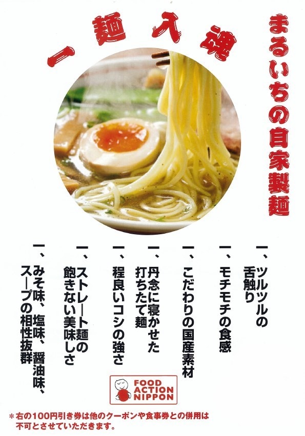 自家製麺とスープのコラボをお楽しみ下さい!近隣のお客様【65歳以上】には送迎サービスも御用意させていただきますのでお気軽にご相談ください! ラーメンの他にも鍋焼きうどんやカレーうどんの温かメニュー、蕎麦と丼ぶりのまるいちセットもGOOD! 皆様のお越しを心よりお待ちしております!今月のクーポンは蓮根&南瓜の天ぷらクーポンを御用意致しました。