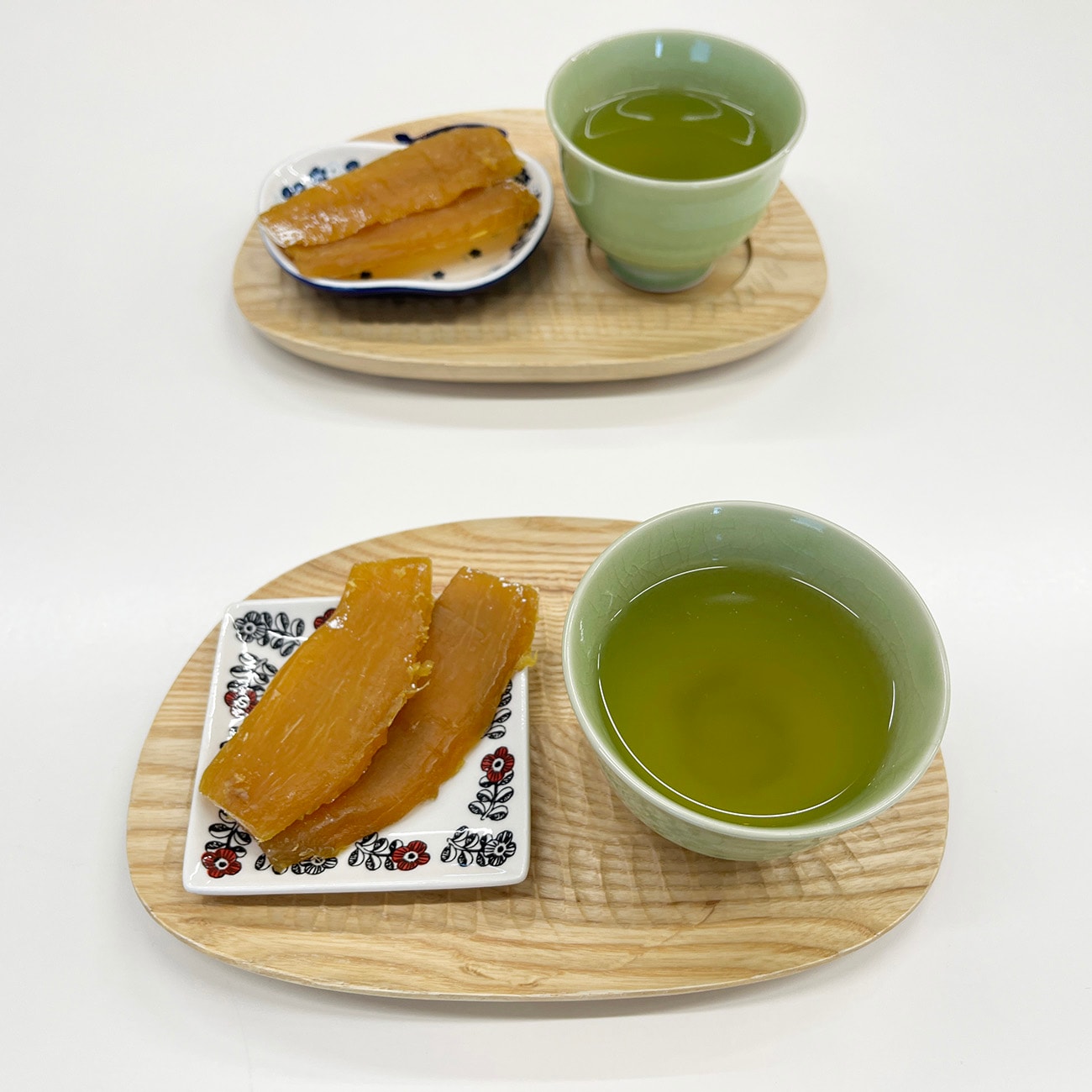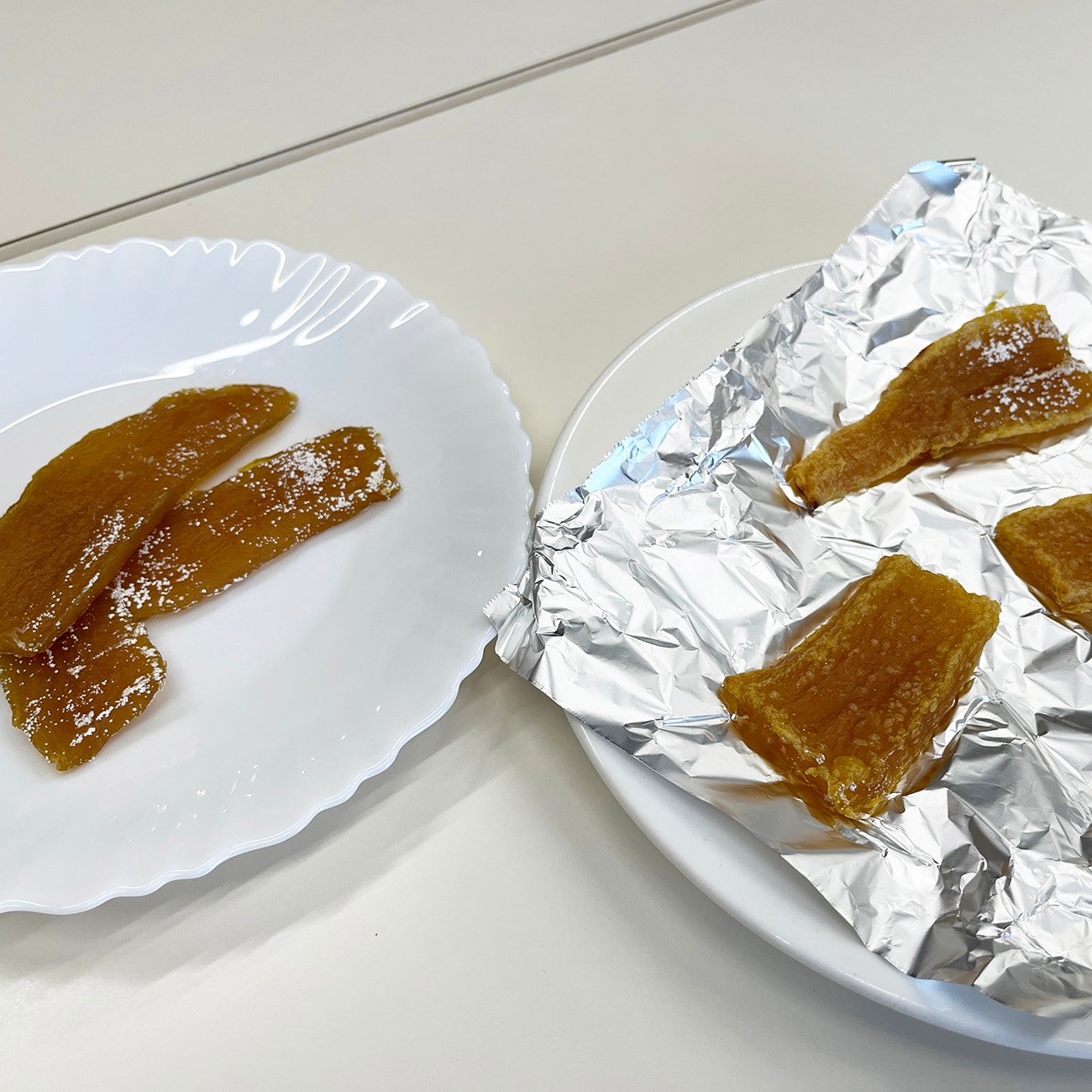「干し芋ってパサついてかたい感じのもあるけど、この干し芋はそのまま食べてもおいしい!レンジで温めたのは、ほんのり温かくてホッとする感じ。焼いた干し芋は表面の香ばしい香りとねっとりとした舌ざわり、甘みがぎゅっと濃厚になって、とってもおいしいね!」と2人。
