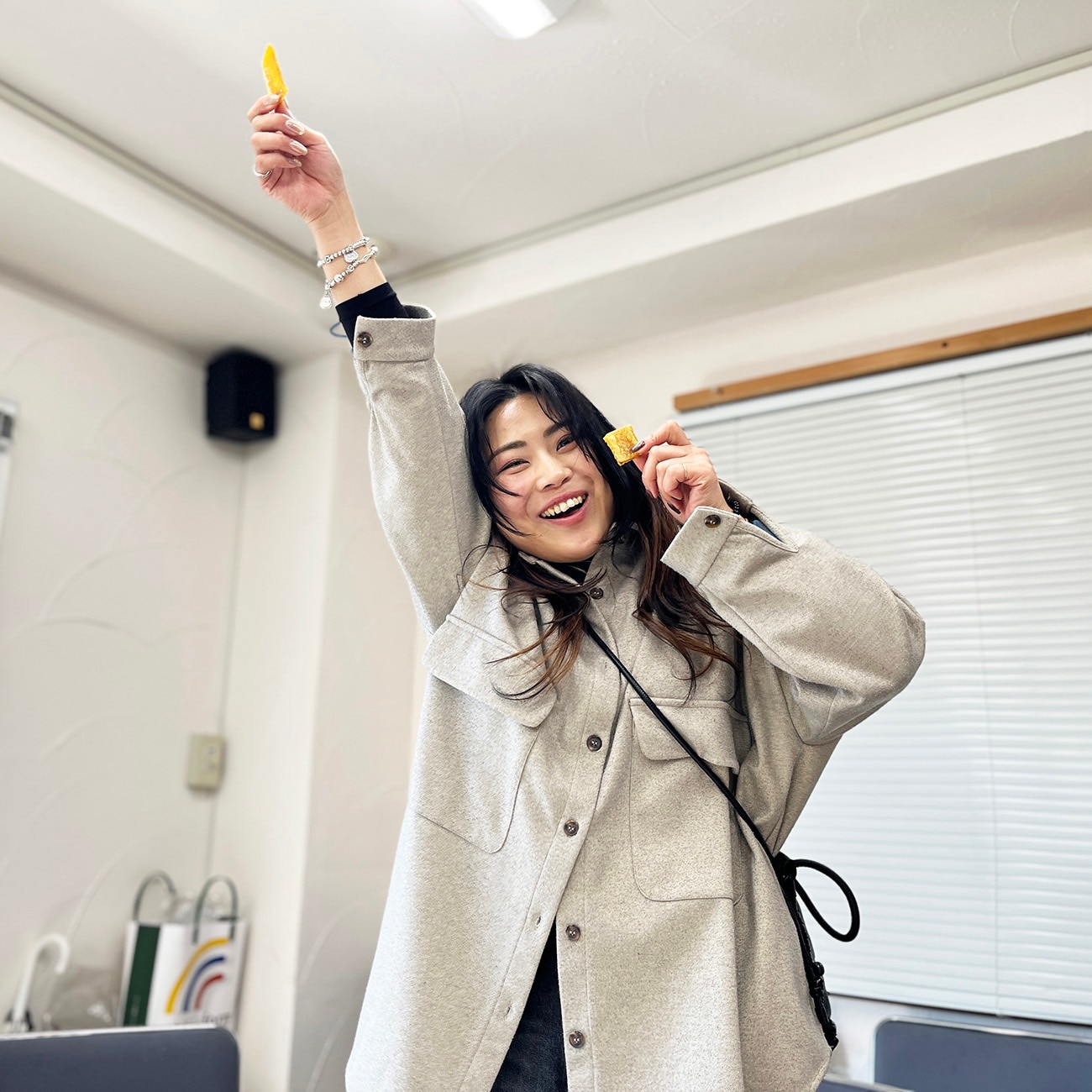 干し芋を手にしてニッコニコの小森&鈴木。