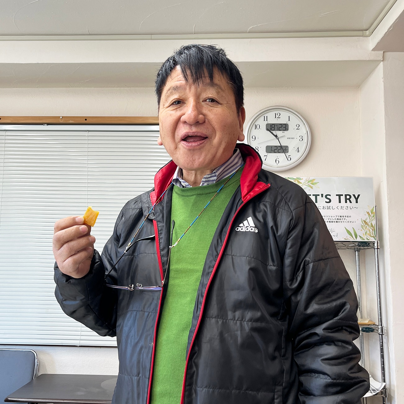 現場から帰ってきたばかりの小森。コンビニでも時々干し芋を買うそうです。