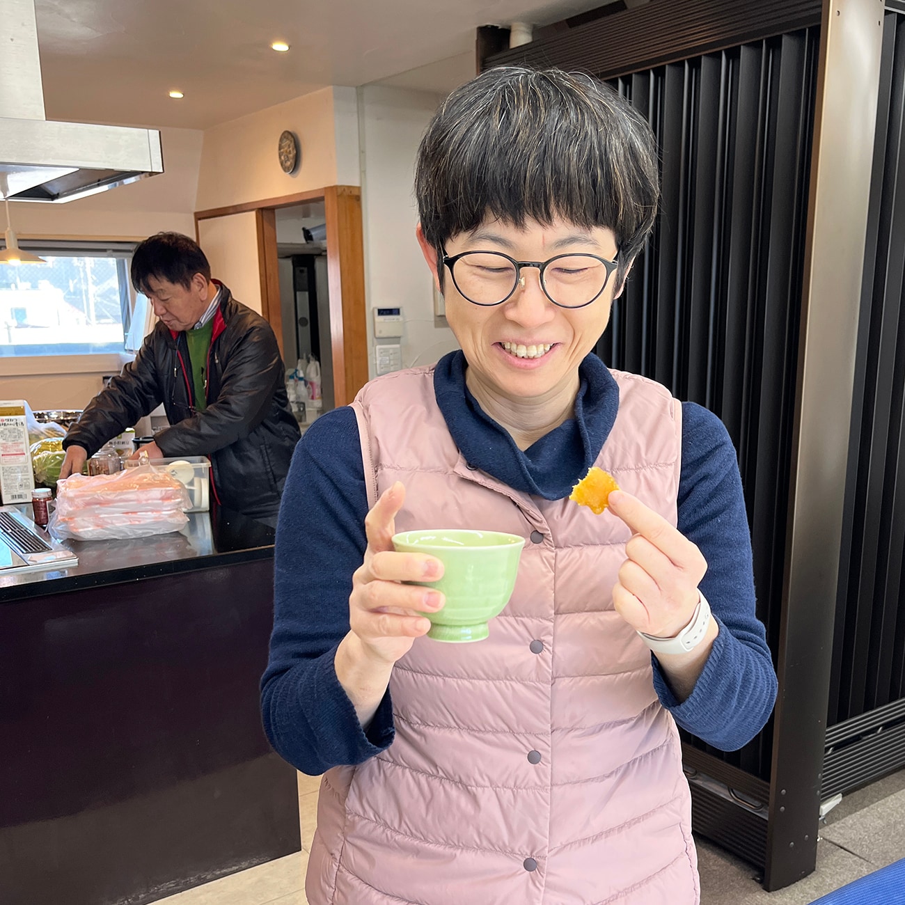 撮影担当の安川も一口。