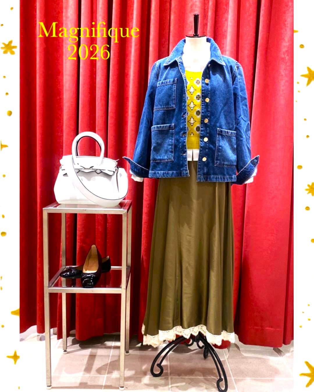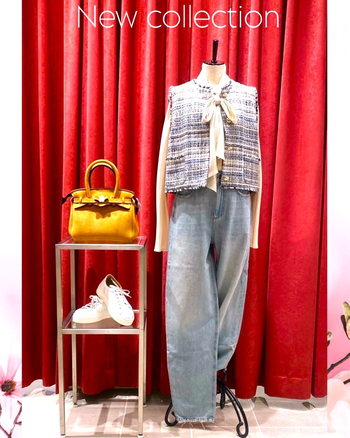 ♡ 一方、店頭には春物が続々届いております🌸🌸 鮮やかなイエローが目を引くインポートらしい柄のニットベスト❣️ ベストなので重ね着しても袖部分がゴロゴロせず、すっきりと着ていただけます。きれい目なスカートに、敢えてBIGシルエットのデニムジャケット合わせで💮