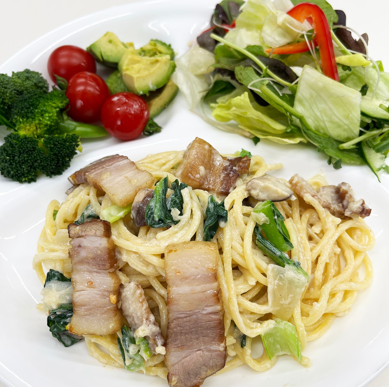 野菜もたっぷり入ったクリームパスタが完成。無添加のベーコンは豚肉のうま味が感じられ、食べ応えがあります。
