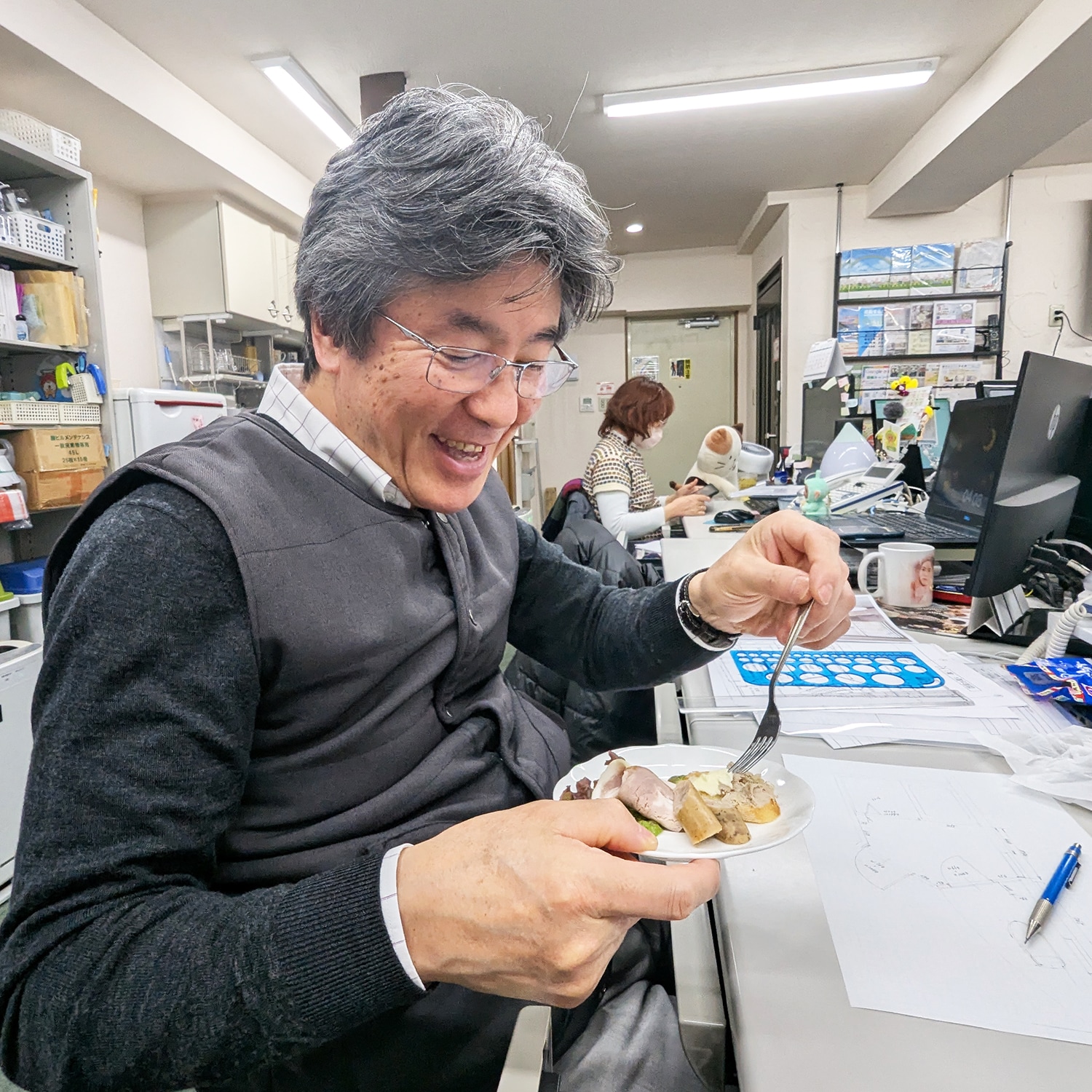 デスクワーク中の鳥羽部長に差し入れに行くと「おっ、待ってました~!」と満面の笑みで迎えてくれました。