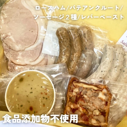 ソーセージおまかせ2種・レバーペースト・パテアンクルート・ロースハムスライスの計5品が入っています。(商品の都合により変更する場合があります。)