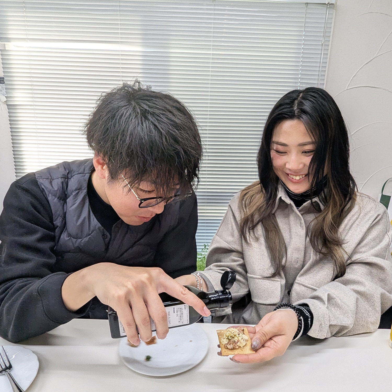 広報・鈴木はパテ・アンクルートを一口食べて「小さいピザみたいでおいしい!」とニッコリ。