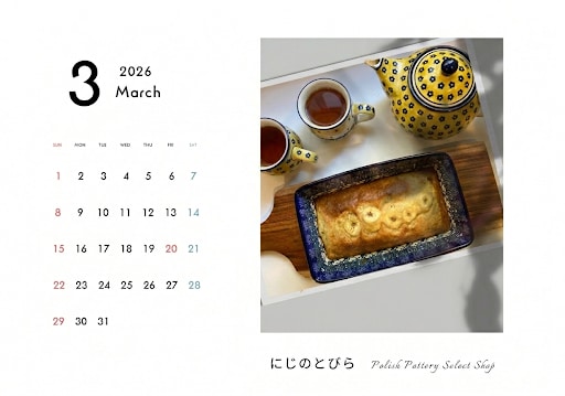 3月のカレンダーですが、ミモザや菜の花などお花の影響か、私の中で春は黄色のイメージなので、黄色のポーランド食器の写真にしてみました。