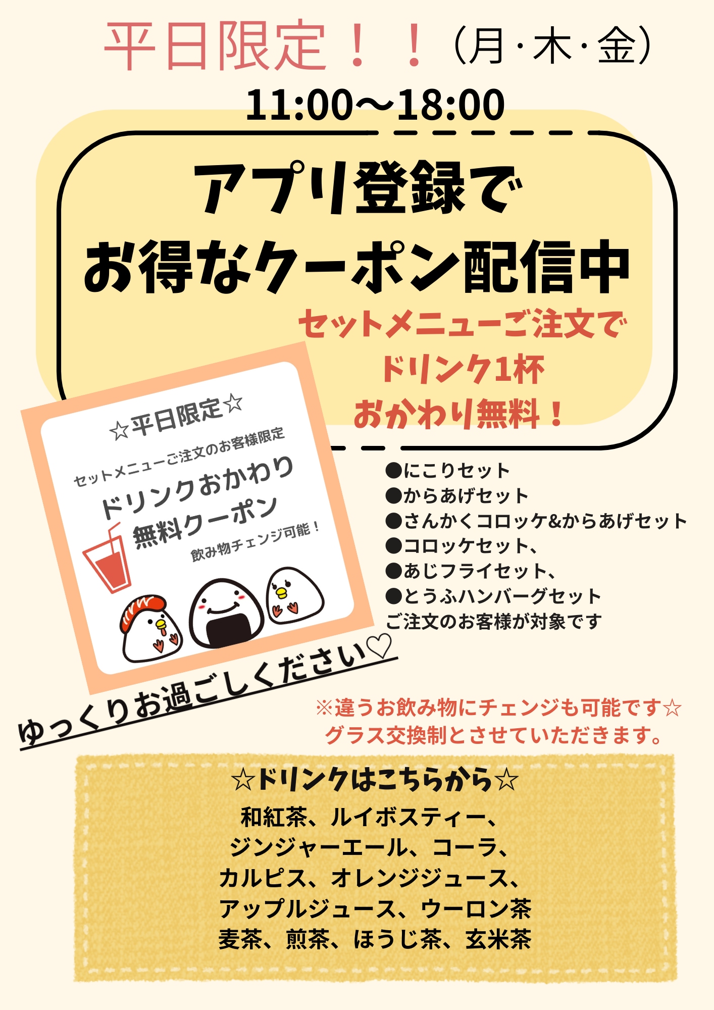 セットメニューご注文で、セットのドリンクがおかわり1杯無料クーポンです😊