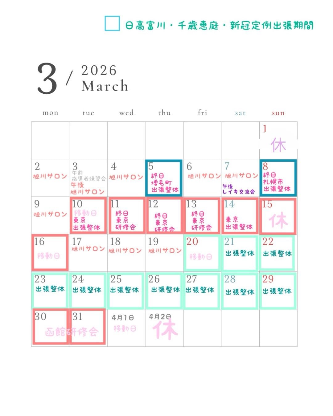 旭川不在の日が多くなってますので、整体のお問い合わせはお早めにお願いいたします。