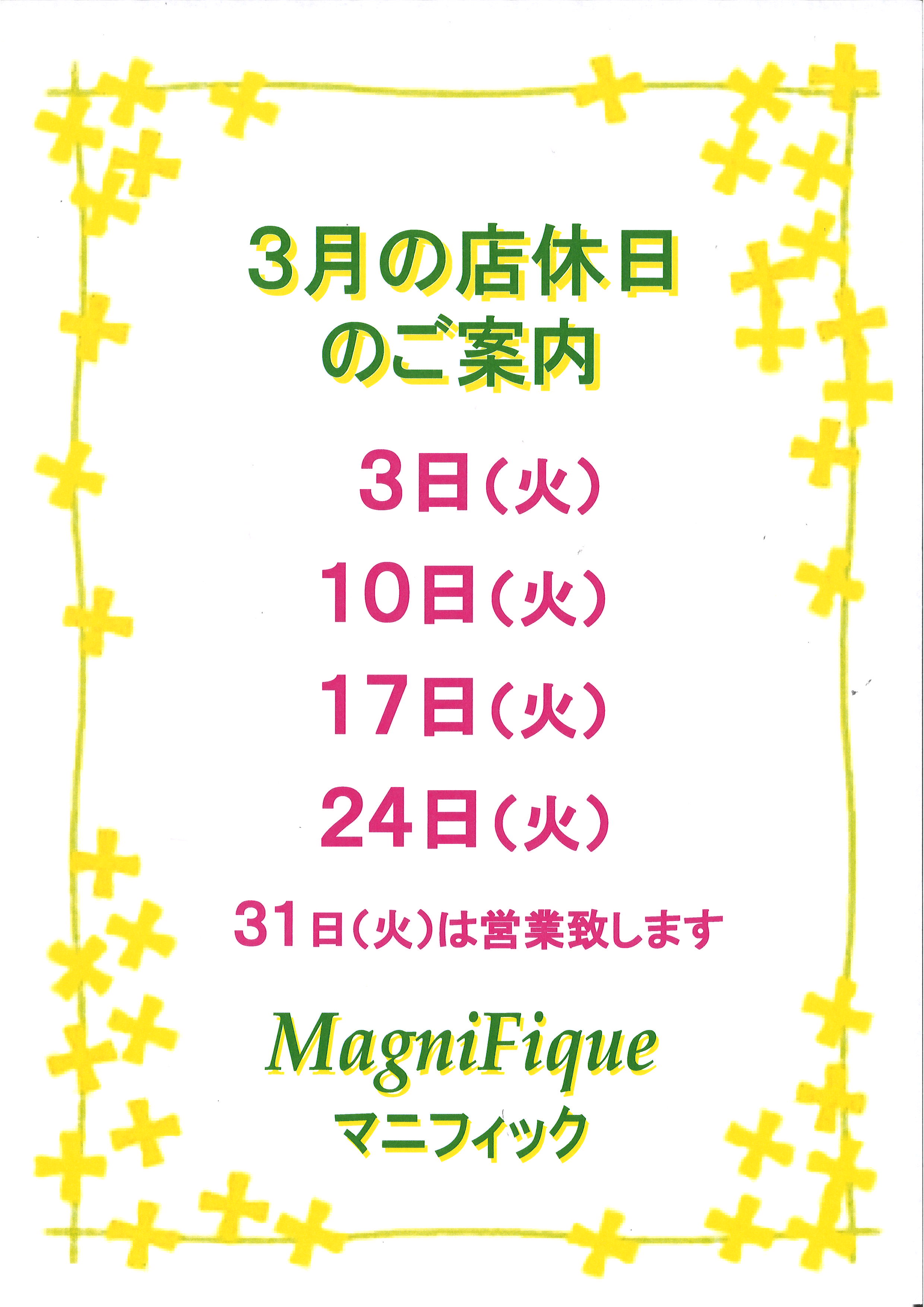 ♡ 3月の店休日のお知らせです📅 お確かめの上ご来店下さいませ😊