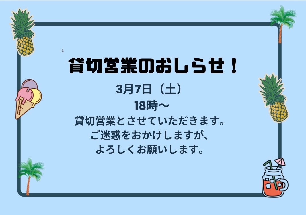 3月7日(土)18時~貸切とさせていただきます。