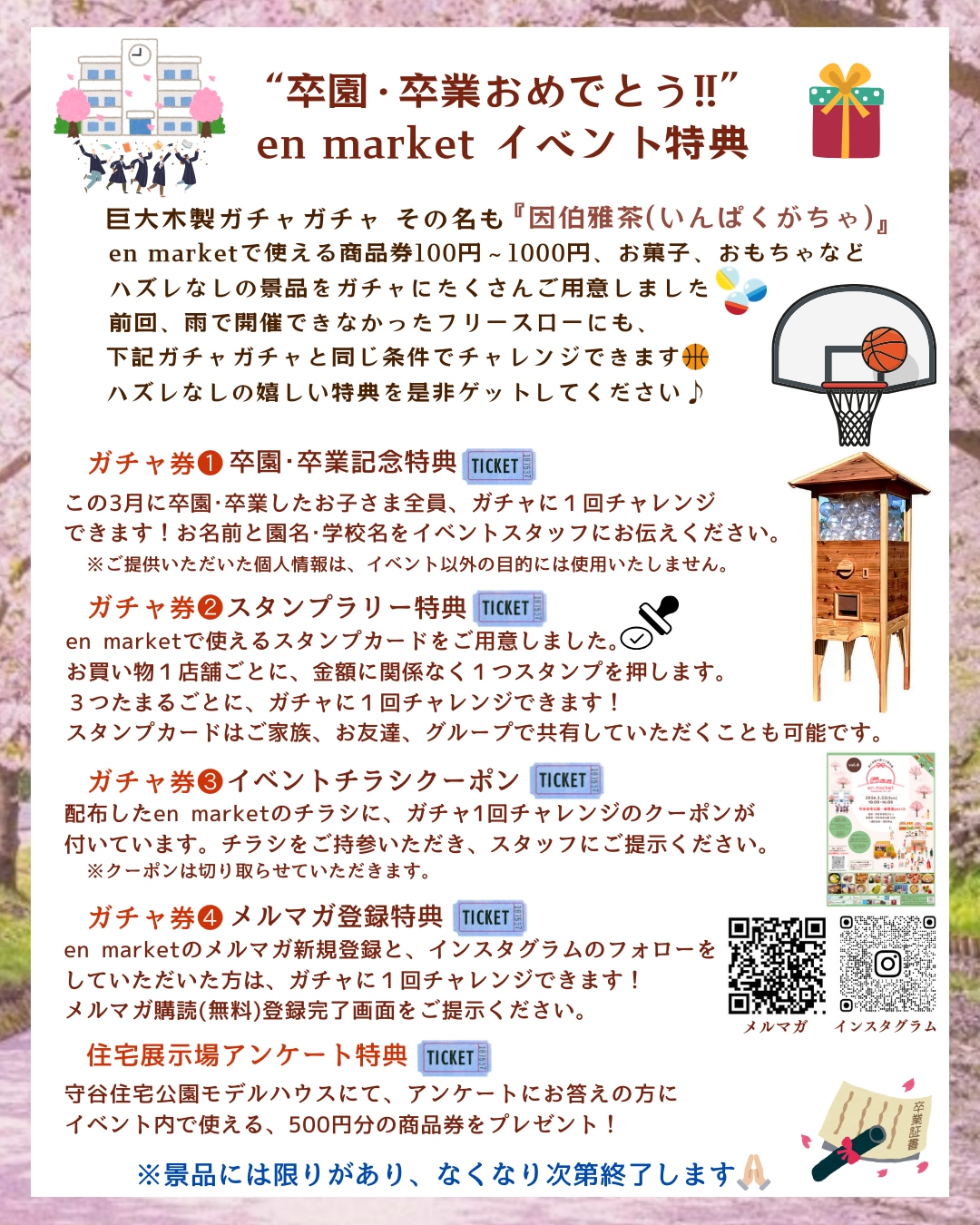 卒園•卒業したお子様への特典、大好評の巨大ガチャガチャ、スタンプラリーに加え、前回悪天候でできなかったフリースローなど、たくさん特典をご用意しております🎁