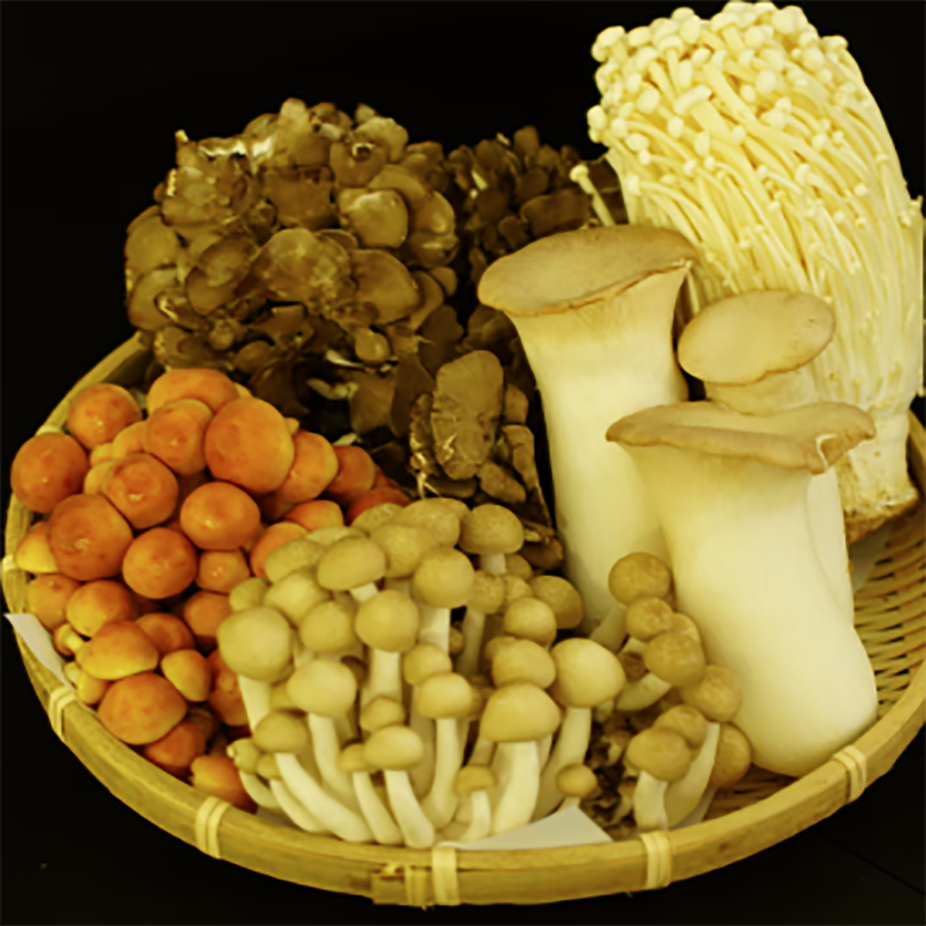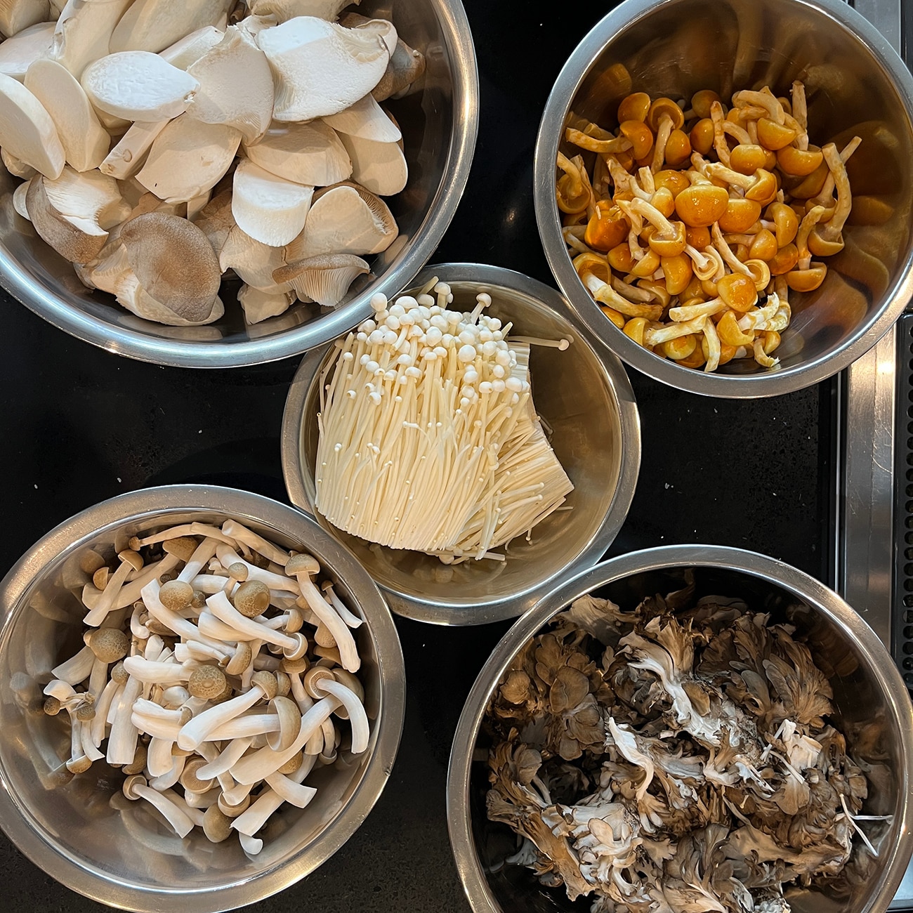 右上から時計まわりにナメコ、舞茸、ぶなしめじ、エリンギ、真ん中がえのきです。