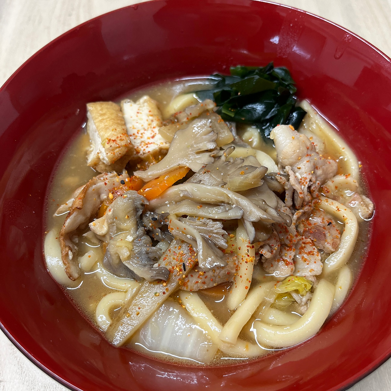 おつゆにもキノコのコクが加わって良い味です。たっぷりのまいたけは、しばらく煮込んでも歯ごたえが残っていました。
