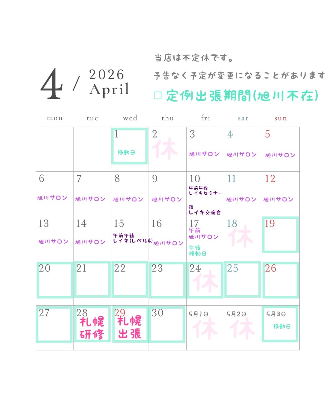 ★5月は「旭川サロン」での予約枠が少なめです。