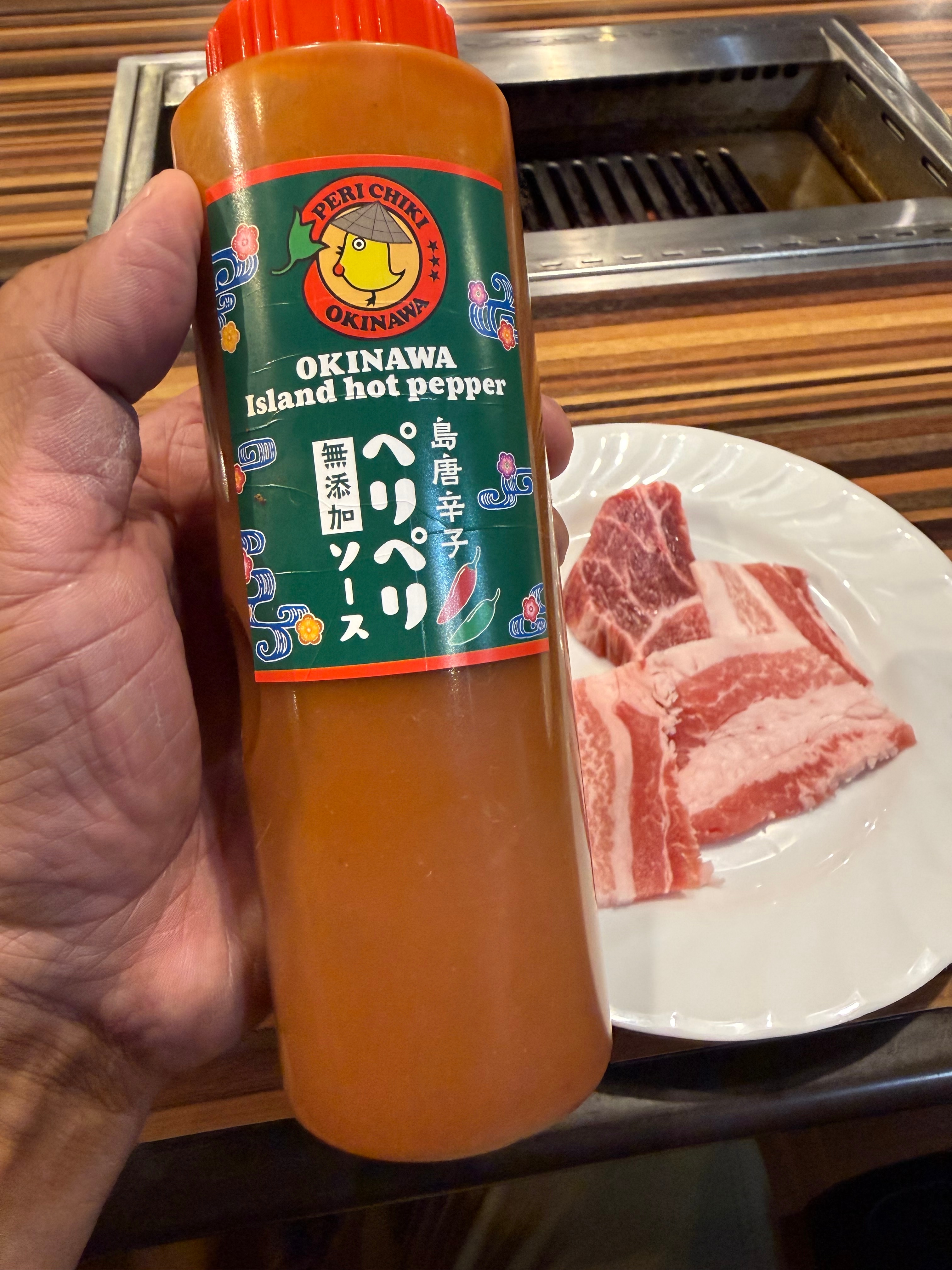 焼きたて熱々のあぐー豚焼肉に、沖縄産のホットソース「ペリペリソース」を振ってスパイシーに頬張れば、「オリオンビール」が進む進む!ぜひ味わってみて頂きたいです♪