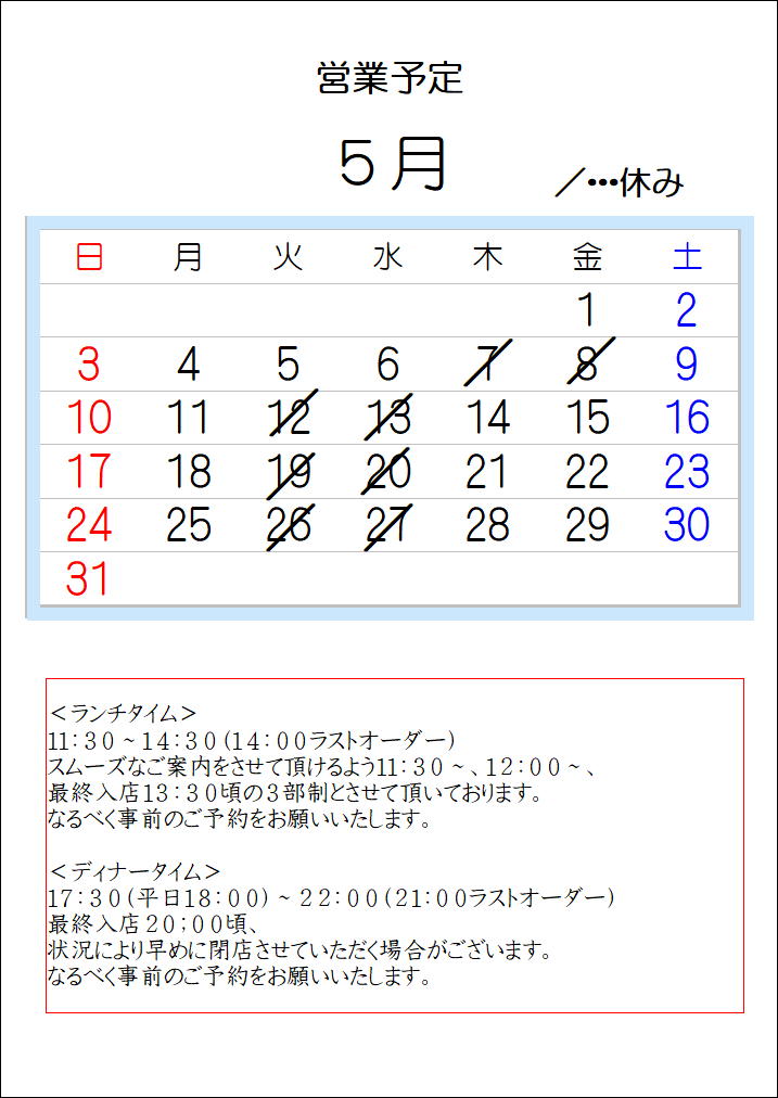 2026.5月の営業予定です。