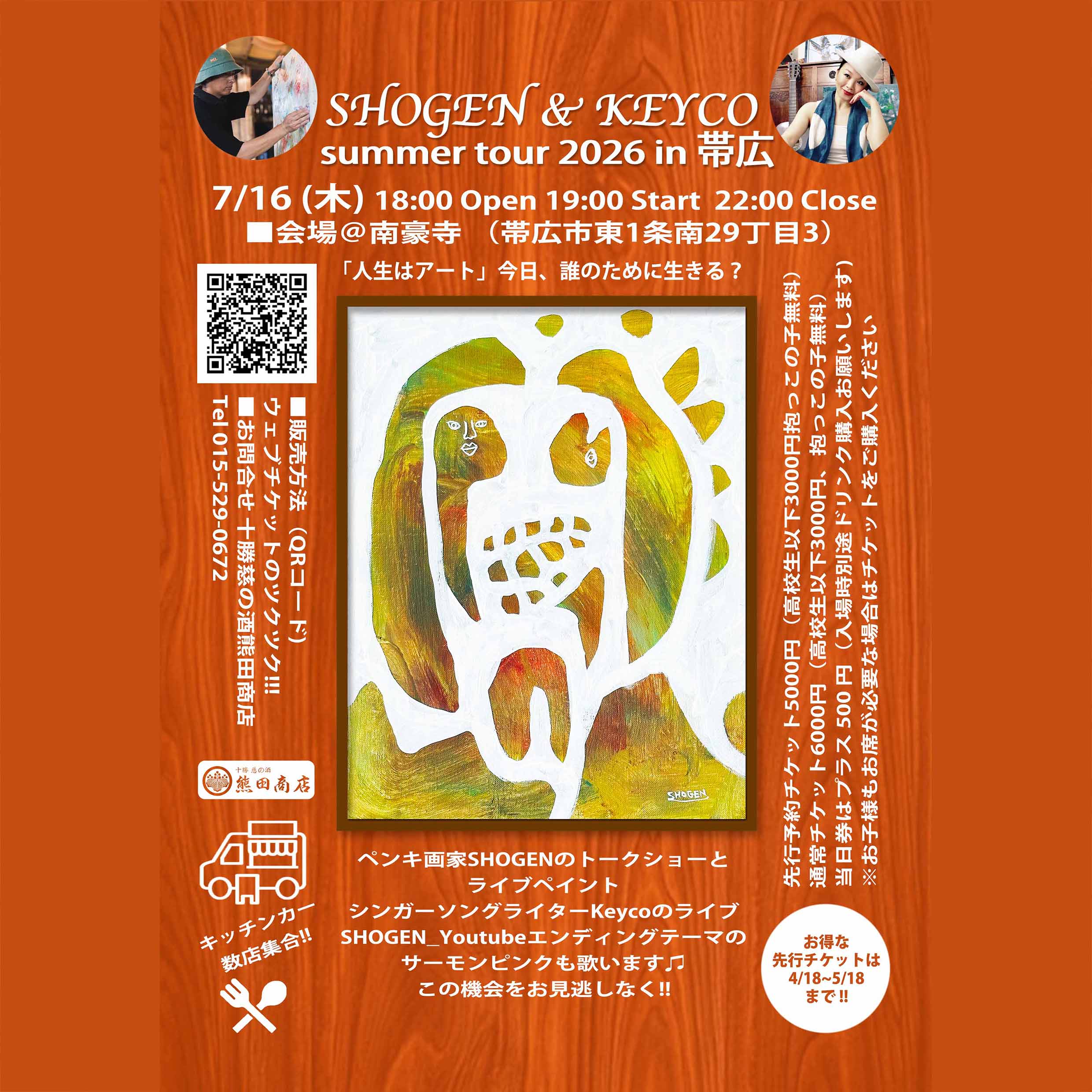 皆様こんにちは!熊田商店でございます!!さて、今回のお知らせは、7月16日(木)19時から『SHOGEN&KEYCO summer 2026 in帯広』を帯広市内の南豪寺さんで行います!皆様SHOGENさんってご存じでしょうか??単身アフリカに行き、ブンジュ村のシャーマンから日本人として大切なものを教えてもらいそれを日本全国に広めている方!!