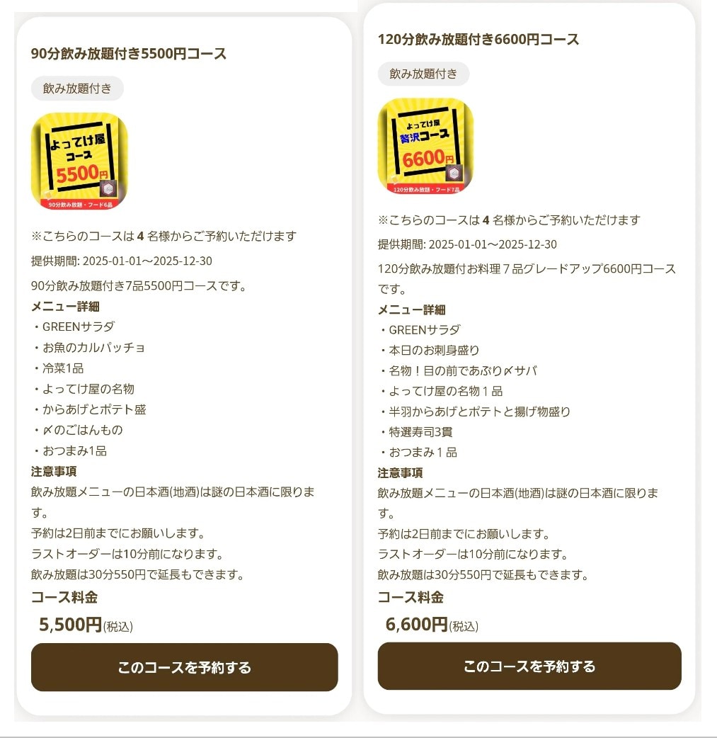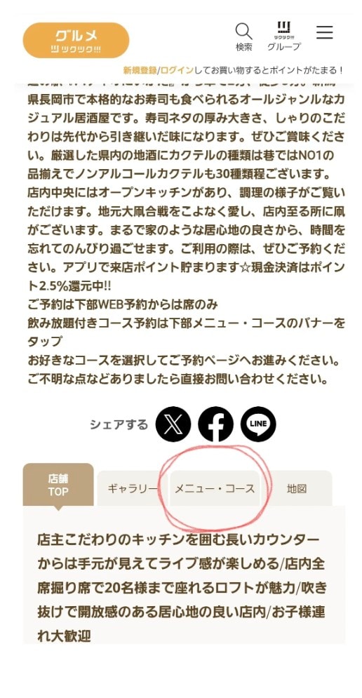 💎飲み放題付きコースの予約⇒『シェアする』の下のメニュー・コースのバナーをタップし、どちらかのコースを選択